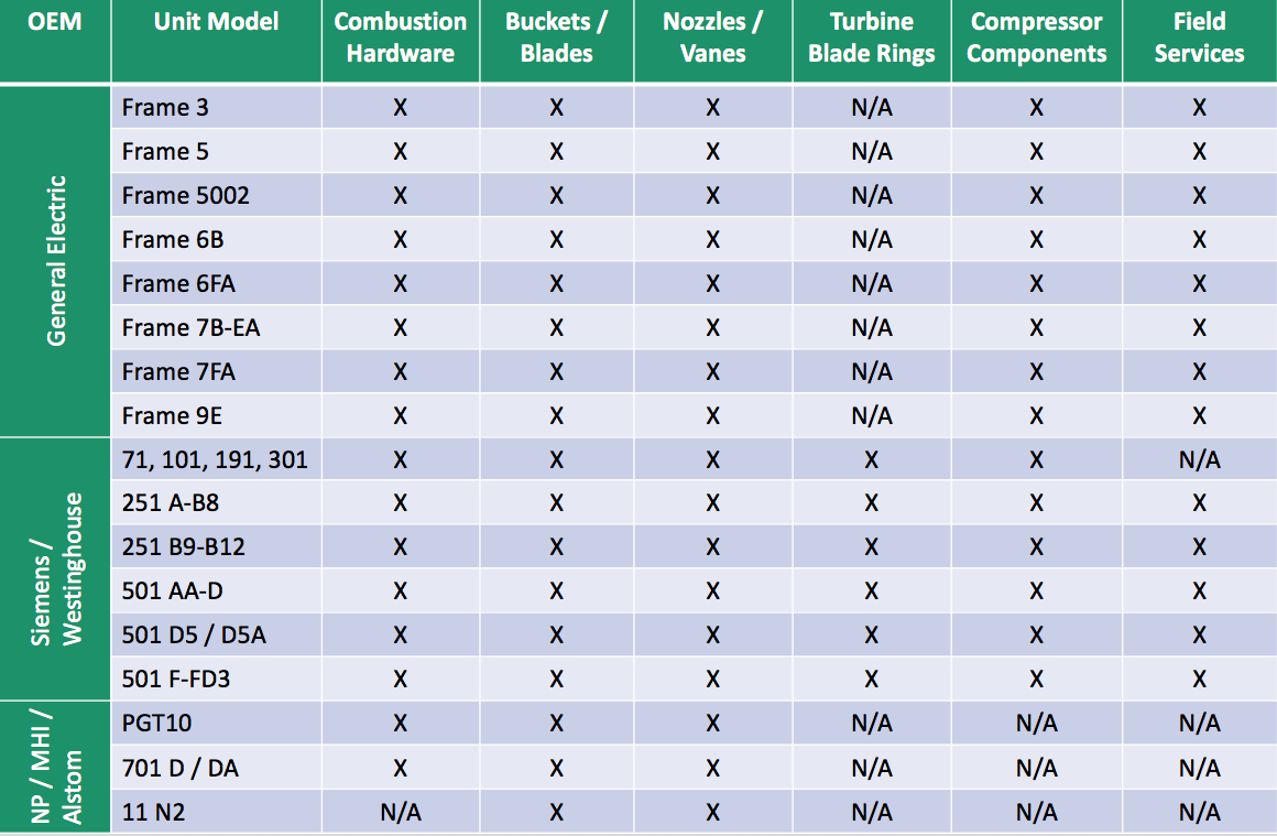 We have the finest staff of engineers, field service, and component repair specialists in the industry. We have full experience with all components including buckets & blades, nozzles & vanes in addition to all styles of combustion components.